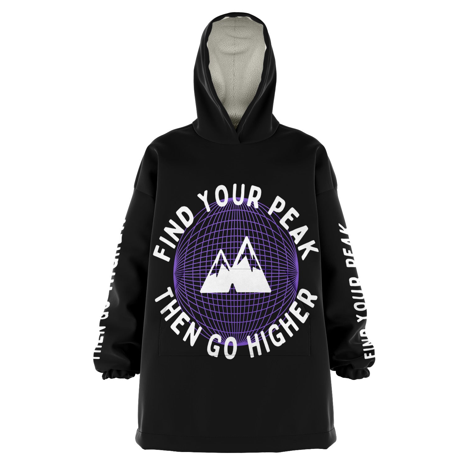 Our "Find Your Peak Then Go Higher" Snug Hoodie is a one-size fits all wearable blanket. This snug hoodie is crafted from an outer silky smooth micro-mink polyester. The inside has an ultra soft microfiber fleece lining. Each panel is individually printed, cut and sewn to ensure a flawless graphic with no imperfections.